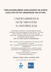 Tónlistarsjóður kirkjunnar og STEFs auglýsir eftir umsóknum um styrki. Umsóknarfrestur er til miðnættis 15. október 2024.