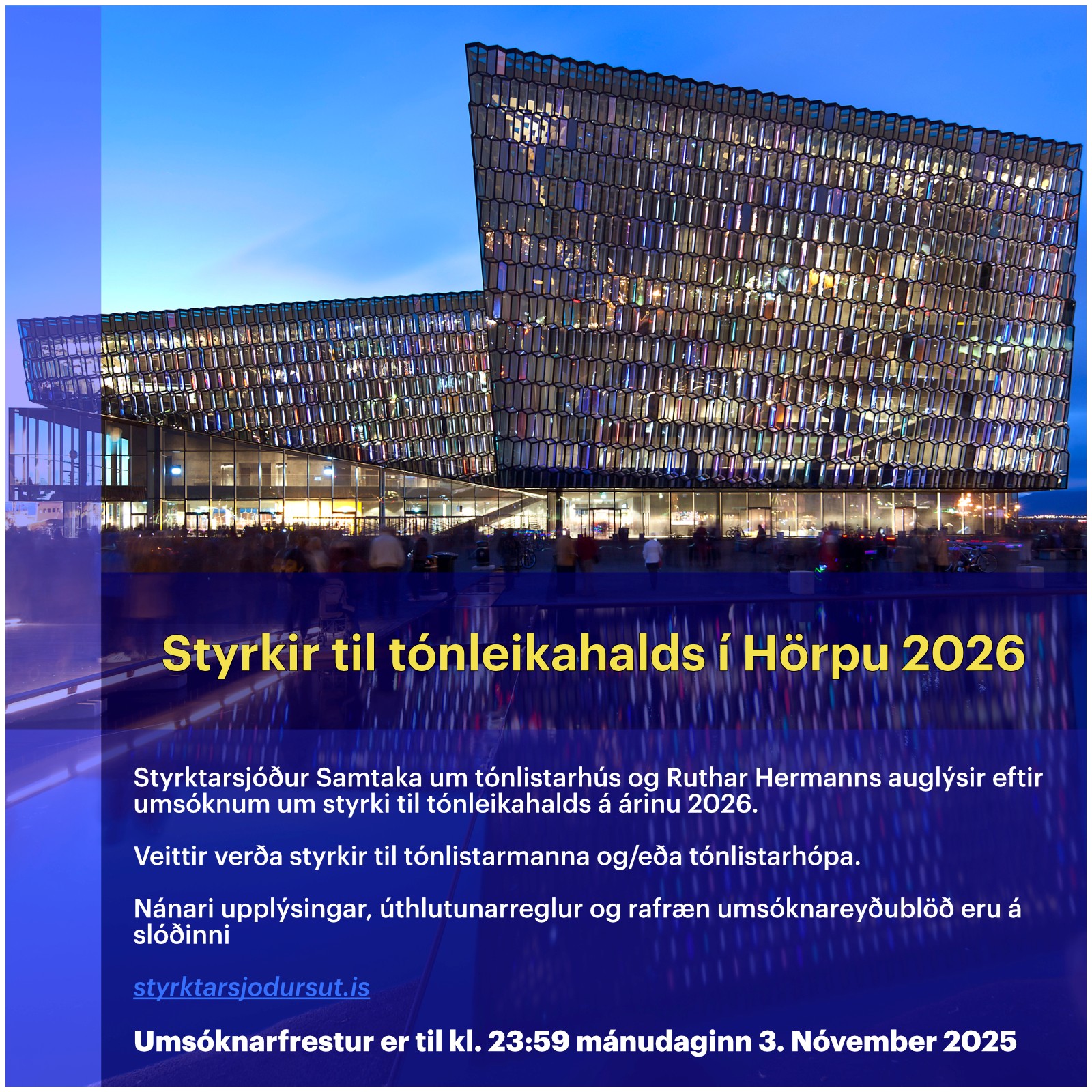 Styrktarsjóður samtaka um tónlistarhús og Rutar Hermanns auglýsir umsóknarfrest fyrir styrki til tónleikahalds í Hörpu á árinu 2026.